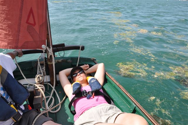 La remontée de la Rance s'effectue sous le soleil. Certains règlent leurs voiles, d'autres dorment.